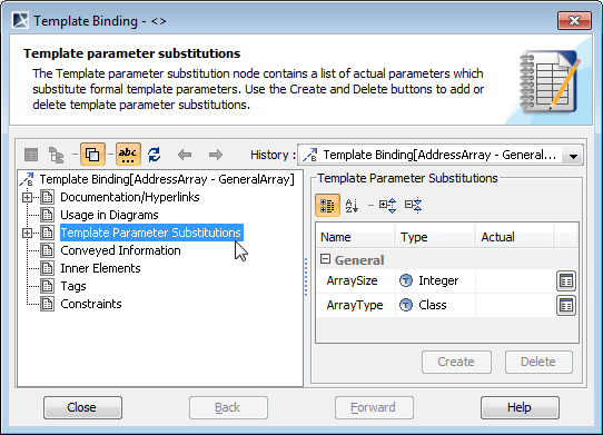 - Define a template parameter substitution. Open the Template Binding Specification window and click the Template Parameter Substitutions property group.
