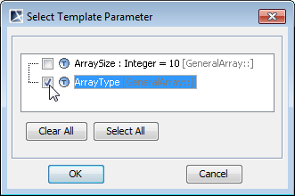 - Select one or more template parameters to add as template parameter substitutions. Click OK to return to the Template Binding Specification window.