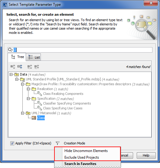If you need to select one of the UML metamodel elements, such as Class, be sure to clear the Hide Uncommon Elements and Exclude Used Projects commands (as in the preceding figure). For more information, read Searching for elements in the Element Selection dialog.