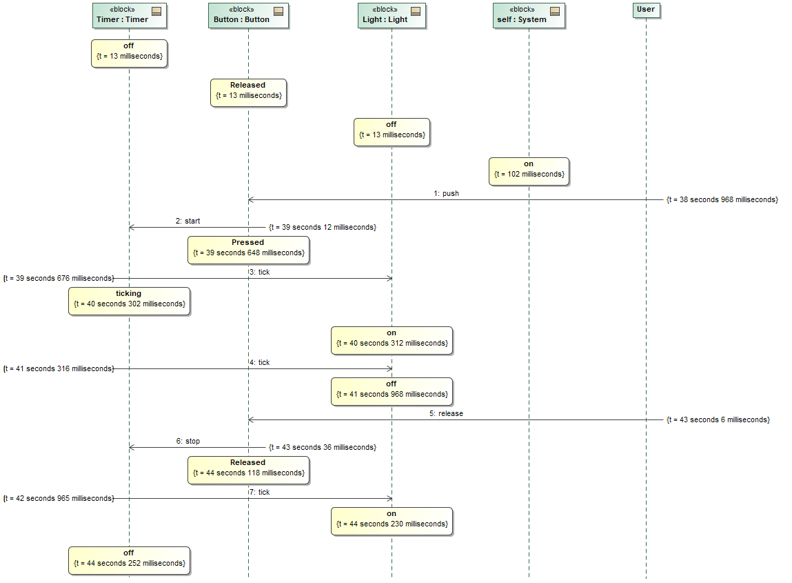 Whenever you simulate a model (such as Flashing Light as shown in the figure above), Magic Model Analyst / Cameo Simulation Toolkit will: