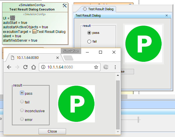 You can simulate the Test Result dialog in the SmallTestSamples.mdzip sample project. You can also change a result value by selecting one of the radio buttons that represents the value: pass, fail, inconclusive, or error. Now the image that corresponds to the value will appear.