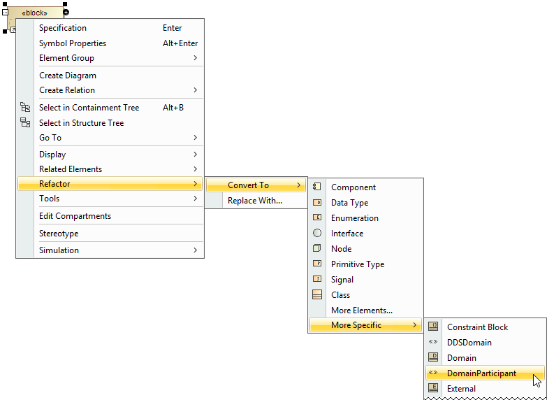- Right-click the Block and select Refactor > Convert To > More Specific > Domain Participant or Domain.
