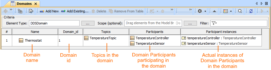 - From the table toolbar, click the Add New button. The new row appears and DDSDomain element is created in the model.