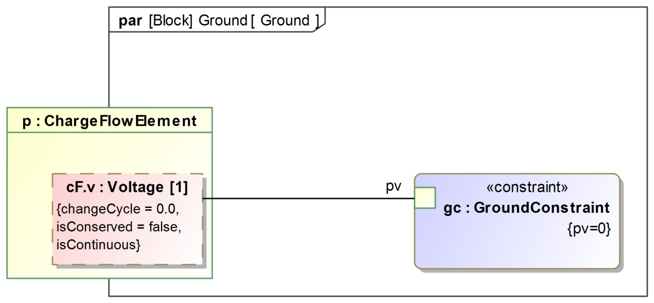 The previously created constraints need to be bound to the variable of each block. To do so, constraint properties are created in each block, and the block variables and parameters are bound to the constraint parameters accordingly. Images bellow show the bindings for the ground, the source, and the resistor respectively.
