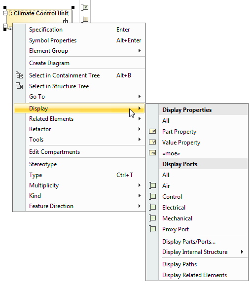 - Right-click either a diagram frame or single/multiple element shapes, and select Display > Display Parts/Ports.