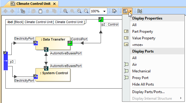 You can display ports, properties, and deep nested ports and properties that have already been created in all structure diagrams. This functionality is driven by stereotypes, which allow you to display properties that stereotypes have been applied to. If you have applied your own stereotypes for the elements (e.g., electrical, mechanical, optical), you can use those stereotypes when selecting the properties you want to display on the diagram pane.
