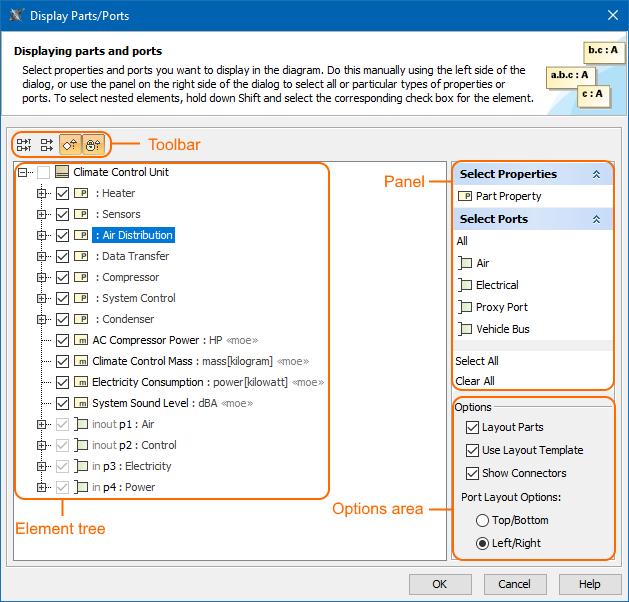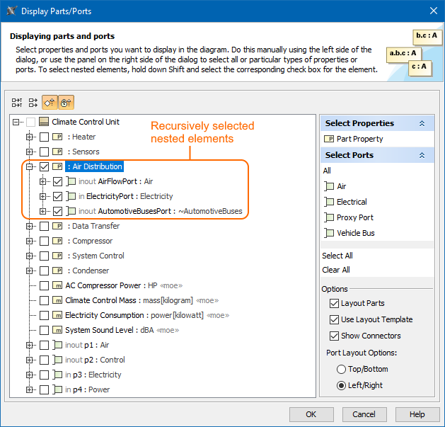 All properties (in this example all ports AirFlowPort, ElectricityPort, AutomotiveBusesPort) of the Air Distribution Part Property are selected recursively by holding down the Shift key while selecting the corresponding check box from the element tree in the Display Parts/Ports dialog.