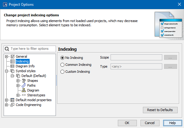 When common indexing is chosen, classifiers and their inheritance relationships will be indexed. If you want more elements to be indexed, select the Custom Indexing option and fine-tune which element types (properties, methods, etc) should be indexed. The more elements you select, the more elements will be accessible in the project using them as proxies. However, your gains in performance from the used project unloading will also diminish. Thus, a balance is needed when customizing the index. It is usually better to use the common indexing variant.