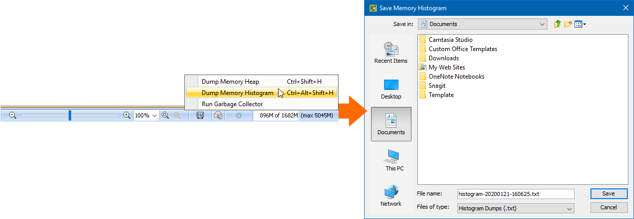 - Click anywhere on the Memory Monitor bar, select Dump Memory Histogram, and then set the desired name and location of the memory histogram file. By default, the name of the file is generated according to the current timestamp.
