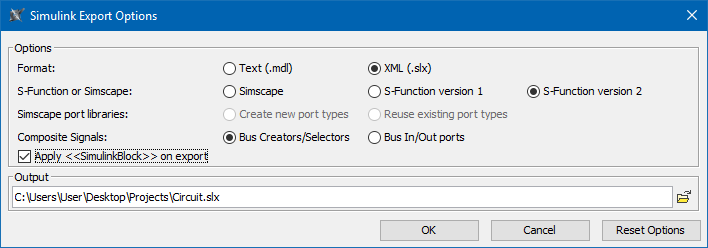 - Specify export options in the Simulink Export Options dialog. Option descriptions >>