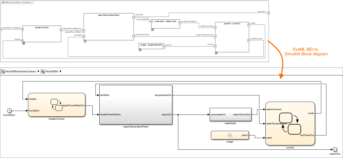 The SysML Internal Block Diagram exported to Simulink Block diagram.