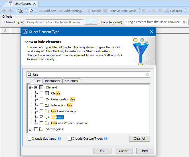 on the View toolbar, in case a smart package is specified as the scope criteria. - Make sure the specified scope contains elements that are specified in the Element Type box. Element types must correspond to the selected element types!