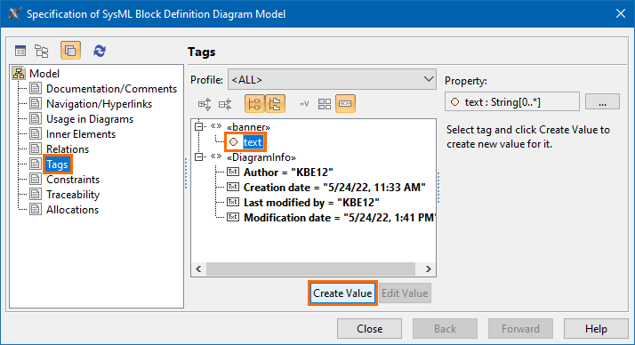 - Under the «banner» stereotype, select the text tag and click the Create Value button.