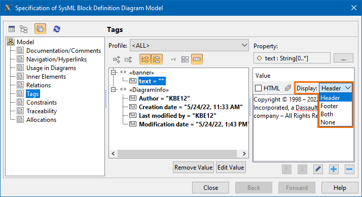 - In the Value box on the right side of the dialog, write the text that you want to have displayed on the diagram banner.