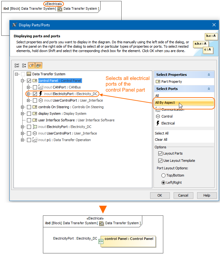 When displaying Parts/Ports in the aspect diagram, e.g., Electrical Data Transfer System Internal Block Diagram, you can display all the parts/ports of an appropriate aspect, e.g., Electrical, by using the All By Aspect button. After selecting this button, all parts or ports that match the diagram's aspect can be displayed. The figure below demonstrates the usage of this button in the Display Parts/Ports dialog when you are trying to display all electrical aspect ports of the selected control Panel part.