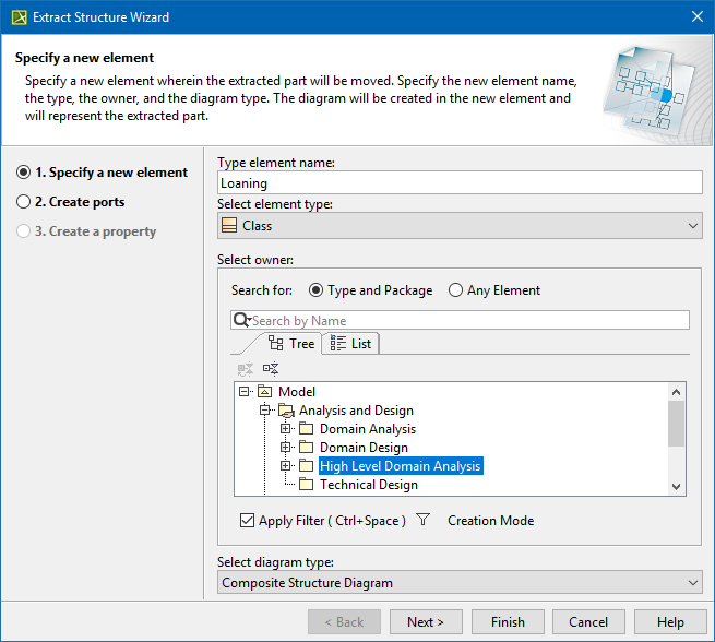 In this step, you can specify a diagram into which the extracted part will be moved and an owner wherein this new diagram will be created. You can also define the type of the newly created classifier element that will own the diagram. The class element and the composite structure diagram type are selected by default. The name of the composite structure diagram will be the same as the specified name of the classifier element.