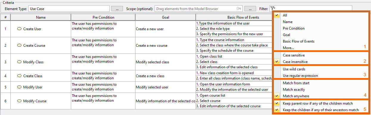 By filtering data in the table you can quickly find the elements you need. This is especially handy when you are working with a large table containing many rows and columns. Elements can be filtered by a phrase specified in the Filter box of the table Criteria area. The following figure shows the Generic table before and after filtering.