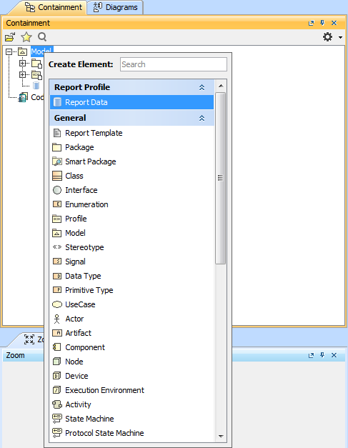 . The Report Profile will be added to your project in read-only mode. - Right-click Model and select Create Element.