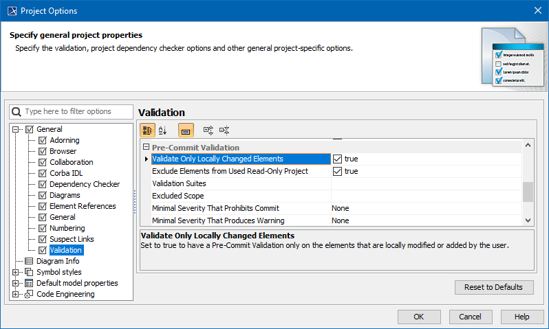 - Specify the options you need in the Validation area. How to use the Project Options dialog >>