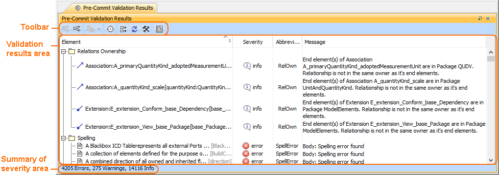 The validation results area provides a list of violated elements. This area contains the following columns: