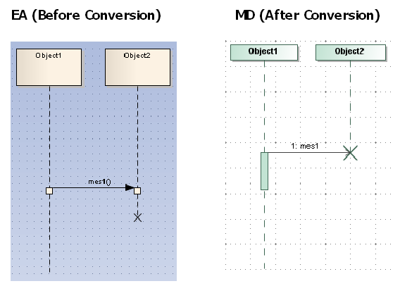 A Sequence Message whose head is connected to a Gate and tail connected to a Lifeline line in EA will be transformed into a Reply Message with its tail connected to one of the boundary lines of the diagram in which it is contained. The Gate itself will be removed