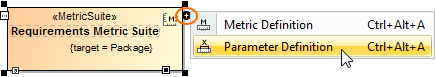 - Click the Create Element button on the right side of the shape and select Parameter definition. The attribute with the «ParamterDefinition» stereotype is created.