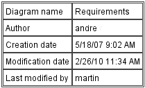 On the diagram, you can display a table containing various diagram details: its name, author, status, the dates it was created and modified, etc. By default, the Diagram info table is displayed at the right top corner of the diagram frame, but you can drag and drop it to any other position on the diagram.