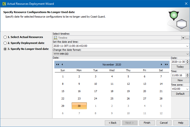 In this step, you can specify the Deployment date and time for the selected Actual Resource configuration to be deployed and used. For the date and time specification, the wizard provides you with the Date and Time Settings dialog. By default, the Today date is selected.
