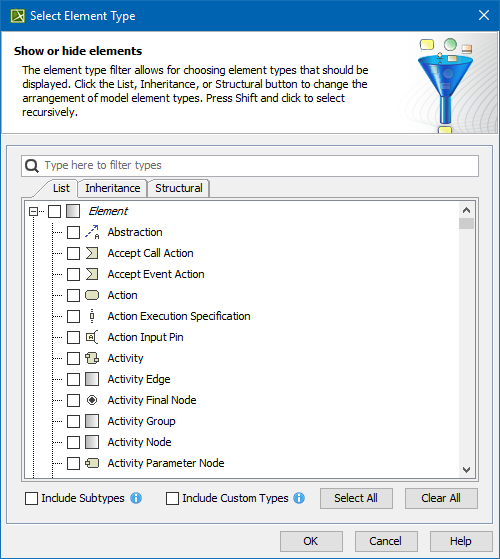 Modeling Tools 2026x General modeling features Diagrams Tables Generic table Current: Adding or removing element types Adding or removing element types To add or remove element typesIn the Criteria area, click the button next to the Element Type box. The Select Element Type dialog with the element and stereotype list opens.Do one of the following:To add the element types, select the appropriate check boxes in the list. Properties corresponding to the selected types will be added to the list of available columns. To remove the element types, click to clear the appropriate check boxes in the list. Properties corresponding to the deselected types will be removed from the list of available columns. Select the Include subtypes check box to display the subtypes of the selected element types.Select the Include Custom Types check box to display the custom types extending the selected element types. To add an element type, you can also drag a selected element to the Element Type box directly from the (2026x) Model Browser.To select adjacent elements, select a single element and hold down the Shift key while you click other elements.To select nonadjacent elements, select a single element and hold down the Ctrl key while you click other elements.The new value of the Element Type box replaces the old value. ×