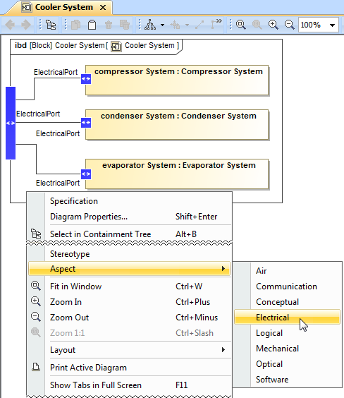 Applying an aspect for a diagram. The illustration displays concepts from SysML v1 Plugin.