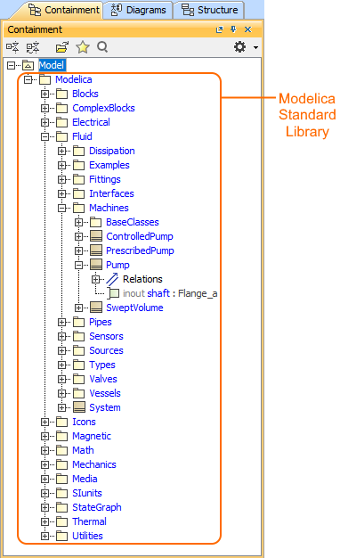 The Modelica Standard Library is imported. See the following figure. All packages with their structure is created in the Containment tree and types are placed in corresponding packages. Note, that file names may do not match with the element names and the file structure may do not correspond to the location in the directory. The package structure is the same as Modelica package structure.