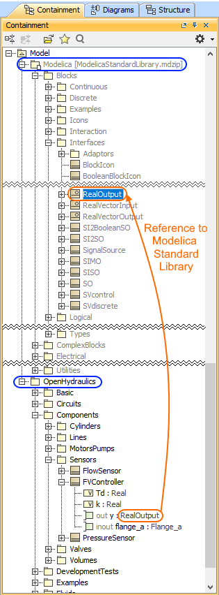 The OpenHydraulics library is imported. The figure below demonstrates the reference between components from OpenHydraulics and Modelica Standard Libraries: the RealOuput type of a Proxy Port y which is in OpenHydraulics library references to Modelica Standard Library.