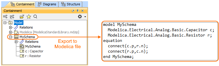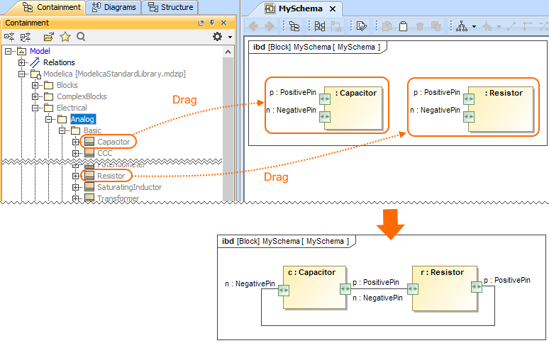 You can create model by dragging Modelica library elements directly on diagram pane. As shown in the figure below, the simple schema is created by dragging Capacitor and Resistor Blocks on IBD diagram pane and displaying all their ports. To complete schema creation, you need to type names c and r  for a Part Properties and connect ports.