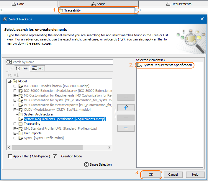 2. Click and in the Select Package dialog, choose another scope and click OK. As shown in the figure below, the System Requirements Specification shared Package is selected.