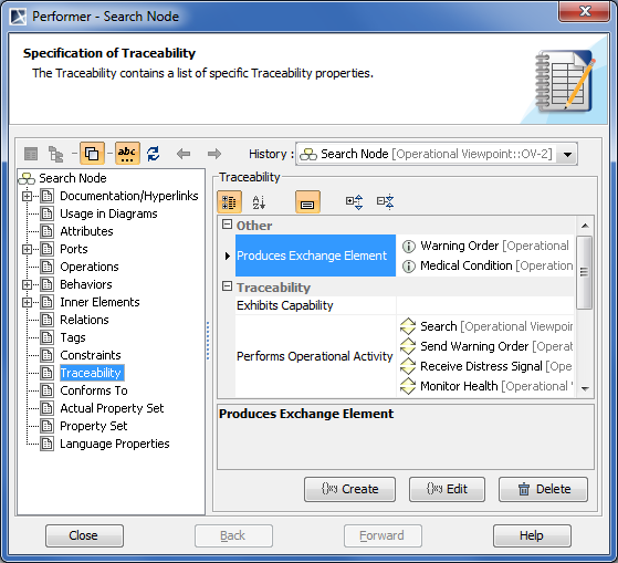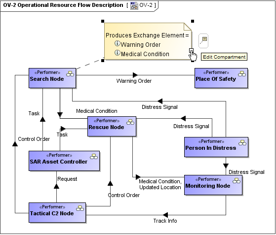We can use a Note element wherein we can display information indirectly related to the Search Node. Let’s draw a Note and connect it to the Search Node performer. Then click the Edit Compartment as it is shown in the following figure. In the Compartment Edit dialog, select the Element Properties tab. From the properties list, select to display the Produces Exchange Element property. After clicking the OK button, Warning Order and Medical Condition exchange elements are displayed in the Note.