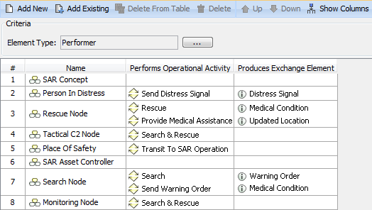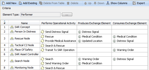 Let’s say, we need to show Warning Order and Medical Condition exchange elements that are produced and consumed by the performer Search Node. Exchange elements are information indirectly related to the Search Node element.