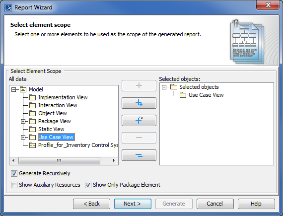 Selecting the Use Case View package from the model as the element scope to be included in the report.
