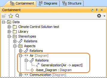 You can define your own diagram aspects that you want to use in the project. You can create custom aspects in the same way you create a new stereotype. The procedures below describe how to create a custom diagram aspect, e.g., Air, in two different ways: