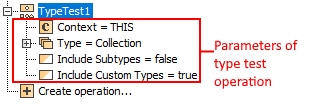 | Click to specify a new type test operation as a condition for selected filter operation. In other cases, the icon is not available. The operation tests, whether the type of the element matches the given type or stereotype. If the types matches, it returns true, and if they not – false. You can also use this operation to check, if the element is an instance of the given classifier. For this operation, you must specify the following parameters: