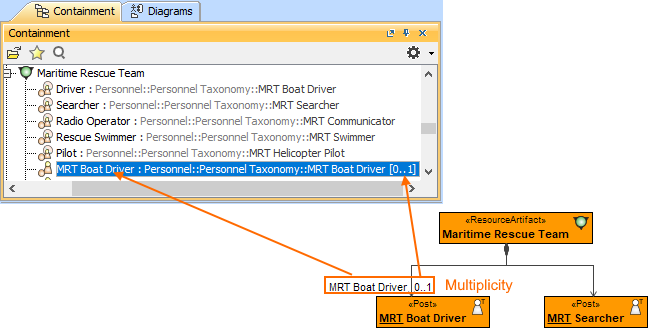 Once the Composition relationships is created, in the Containment tree, you can see the Composite element and note the Resource Roles (Part Properties) displayed within the namespace of the Composite element and how the element type and multiplicity is shown.