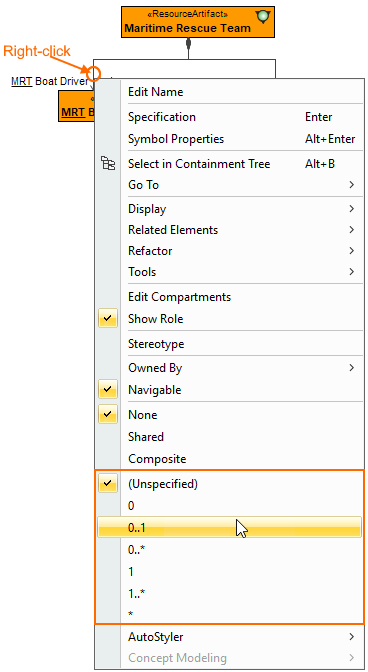 - At the bottom of the shortcut menu, choose one of the default multiplicity values.