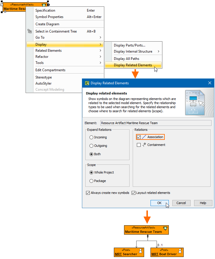 If Resource Artifacts (or other structural elements) were related using the Resource Association relationship, select the Resource Association also.- Click OK.
