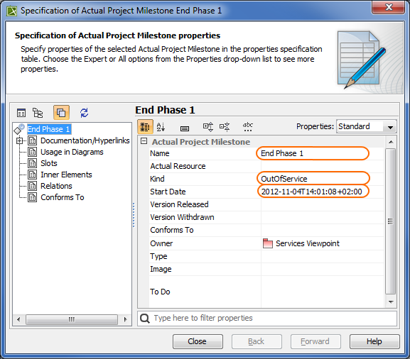 - In the Specification window of the newly created Actual Project Milestone specify three properties: