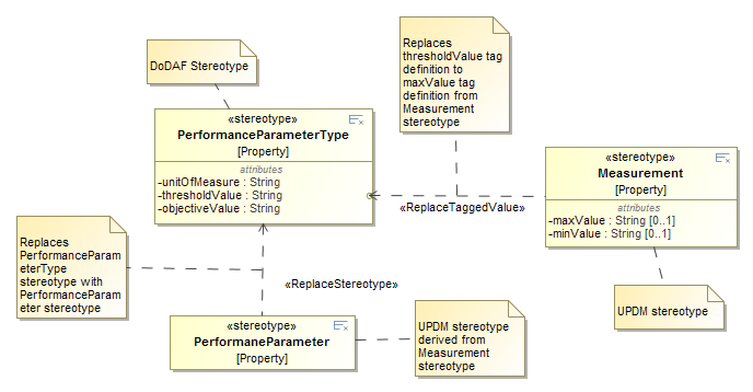 As shown in the figure "Migration basics", PerformanceParameterType [Property] stereotype from DoDAF profile is marked to be replaced with PerformanceParameter [Property] from UPDM profile. Also threshold tag definition owned by PerformanceParameterType should be changed to maxValue tag definition owned by Measurement element from UPDM profile.