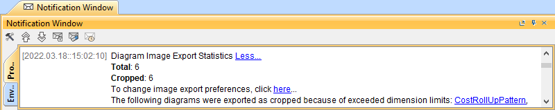 The Details... link in the notifications opens the Notification Window, which displays Diagram Image Export Statistics with the following information: