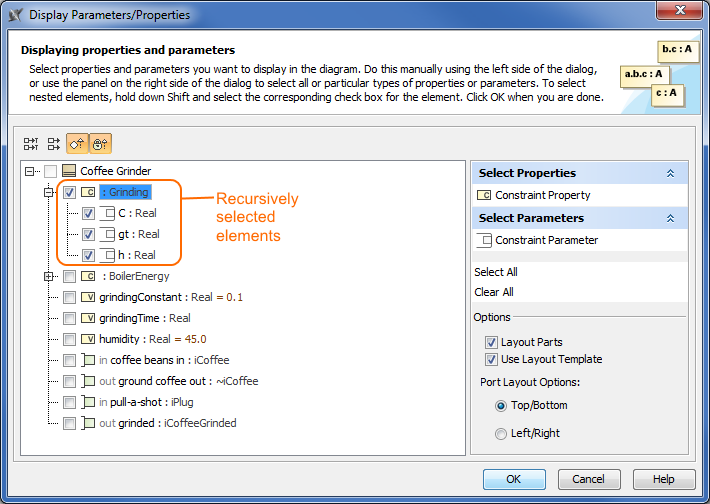 - Select recursively nested elements by holding down the Shift key while selecting the corresponding check box for the element.All Constraint Parameters C, gt, h of the Constraint Property typed by Grinding Constraint Block are selected recursively by holding down the Shift key while selecting the corresponding check box from the element tree in the Display Parameters/Properties dialog.