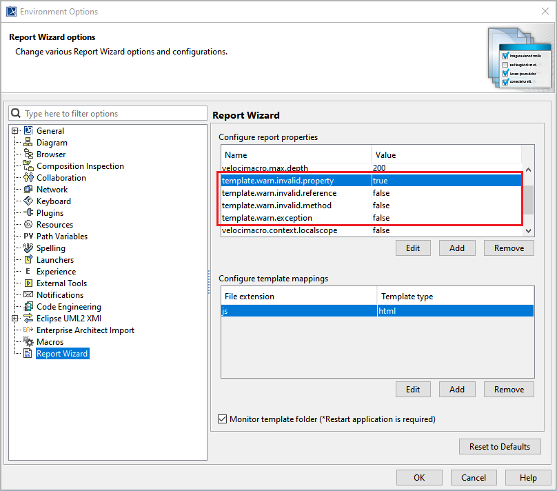 - Edit the config.xml file and create a file in the ...\plugins\com.nomagic.magicdraw.reportwizard\data\templatefolder folder to enable or disable each template's warning message.
