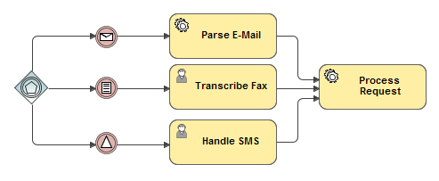 An Event Based Gateway represents a branching point in a process where alternative paths that follow the gateway are based on the events that occur rather than on the evaluation of expressions using process data (as with an Exclusive or Inclusive Gateway). A specific event, usually the receipt of a message, determines which path will be taken. Basically, an Event Based Gateway is used when a decision made by another participant is based on data that are not visible to the process.