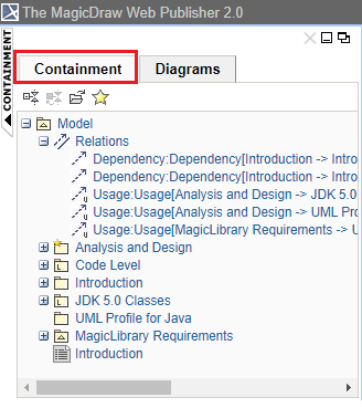 1. Containment panel - This panel contains two tabs: Containment and Diagrams. The Containment tab shows data of a project in a tree structure, and the Diagrams tab shows all diagrams in a project. In each tab, there are four toolbar buttons as follows.