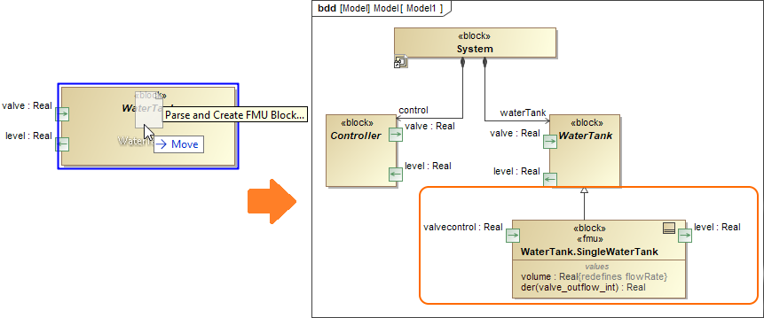 - Drag and drop the file from your file system or the Containment tree onto the BDD diagram. A Block with the applied «FMU» stereotype is created in the model after customizing the FMU import via the FMU Import Options dialog.